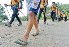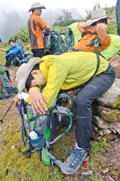 | 슬리퍼를 신은 채 20㎏이 넘는 짐을 짊어지고 산을 오르는 포터의 모습에서 그들의 고단한 삶이 느껴진다. |
