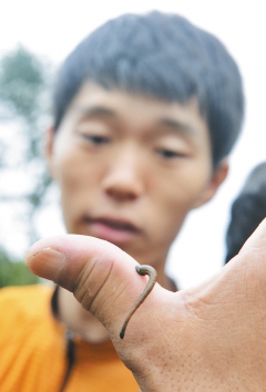 | 엄지손가락에 붙은 산거머리. |