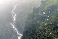 다음 목적지는 페티(3천730m). 고소 적응을 위해 고도를 많이 높이지 않았다. 걷는 동안 여러 개의 폭포를 만났다. 높은 산에서 내려오는 물줄기는 장관이었다. 굉음을 내며 떨어지는 물줄기, 우기 때 이곳에서만 볼 수 있는 장면이다. 나이애가라, 이구아수 폭포처럼 웅장하지는 않지만 200∼300m 높이에서 떨어지는 물줄기는 강렬한 인상을 줬다. 안개가 껴 전체적인 모습을 볼 수 없는 것이 안타까울 뿐.